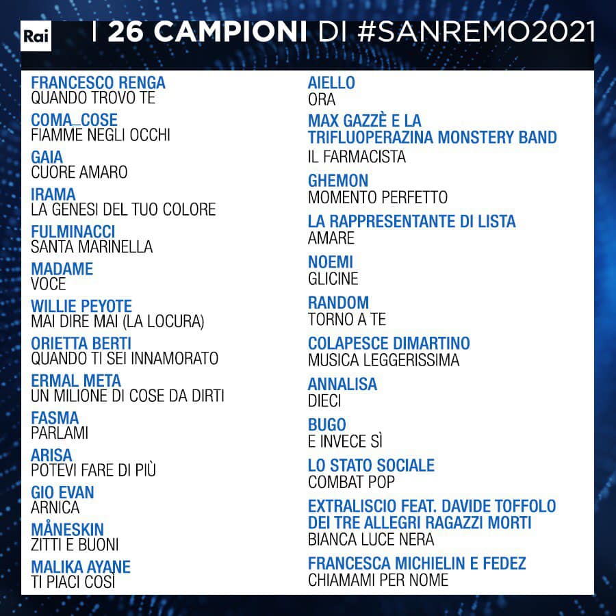 Conduce Amadeus e Fiorello per il secondo anno di fila, ci sono 26 big in gara e Bugo è stato ritrovato.